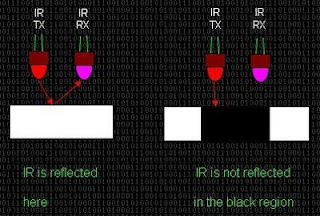 Contohnya seperti gambar ni.Apabila tiba tiba "penerima" infrared sensor mengesan cahaya infrared,maknanya kereta dah masuk kawasan putih (lari dari haluan) dan akan mengubah haluan untuk mengikut line hitam itu balik.